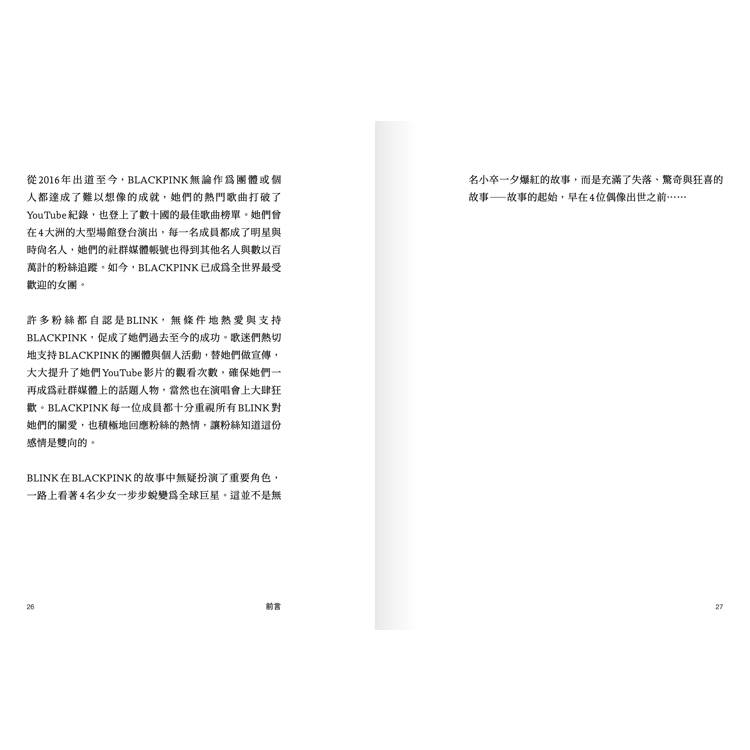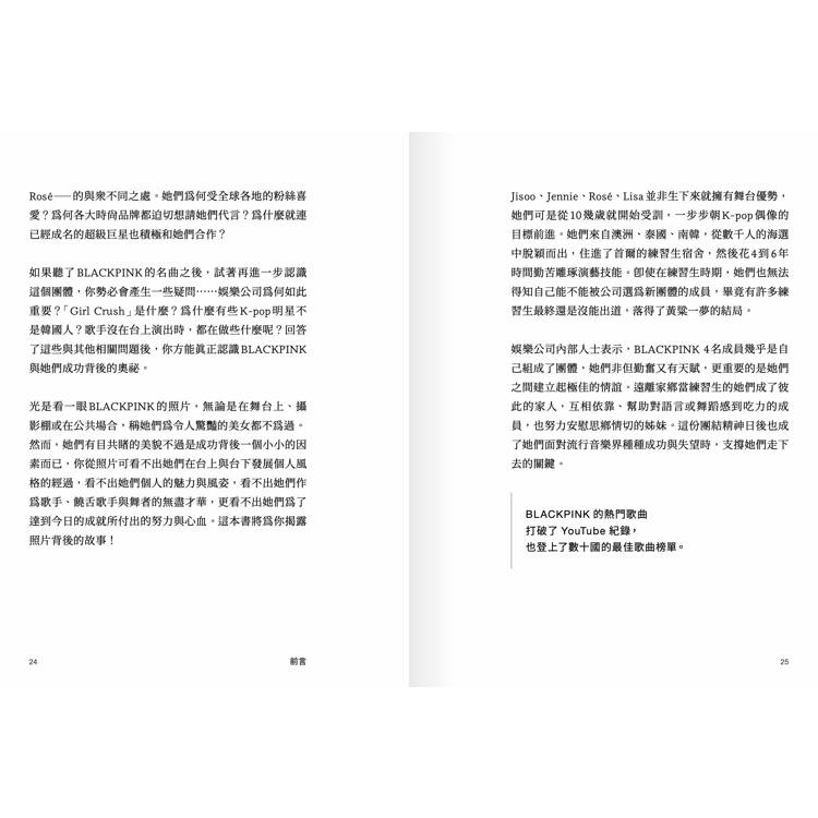 光是看一眼BLACKPINK的照片,無論是在舞台上、攝影棚或在公共場合,稱她們為令人驚豔的美女都不為過。然而,她們有目共睹的美貌不過是成功背後一個小小的因素而已,你從照片可看不出她們在台上與台下發展個人風格的經過,看不出她們個人的魅力與風姿,看不出她們作為歌手、饒舌歌手與舞者的無盡才華,更看不出她們為了達到今日的成就所付出的努力與心血。這本書將為你揭露照片背後的故事!