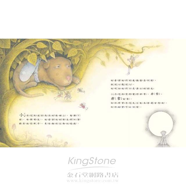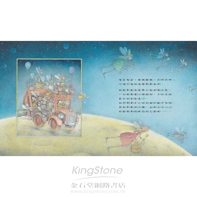 用細緻的色鉛筆畫出魔幻美麗的月亮上善良的月亮狗和他的主人分離而後重聚的喜悅。他的構圖縝密、筆觸蘊含生動的情感,把月亮先生的沉靜和仙子們古靈精怪卻令人惱慍的行徑,都活靈活現的搬到書頁間上演。