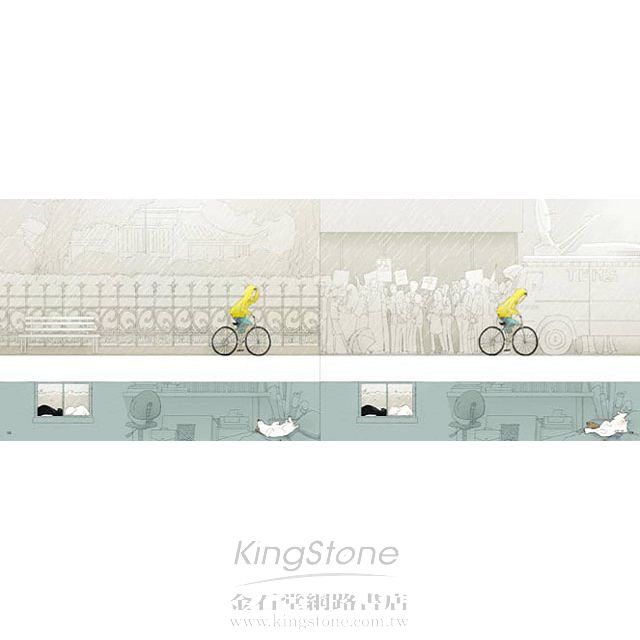 《午後》不僅滿足孩子騎單車逛台北的愉悅想像,也滿足孩子善於捕捉細節的觀察本能。住在台北、曾經來過台北、很想來台北逛逛的小讀者們,很輕易就能在各頁畫面上發現:7-11便利商店、學校、銀行、鼎泰豐、甜甜圈店、中正紀念堂、仁愛路上的豪宅、林蔭大道、國父紀念館和台北一○一……另外,還可以一路跟著畫中少女的單車身影,陸續遇見:賣彩券的女孩、化緣的出家人、準備出遊的一家三口、路邊攤、示威靜坐、媒體採訪、流浪漢、流浪狗……翻著書,就彷彿進行了一趟多采多姿的城市小旅行!