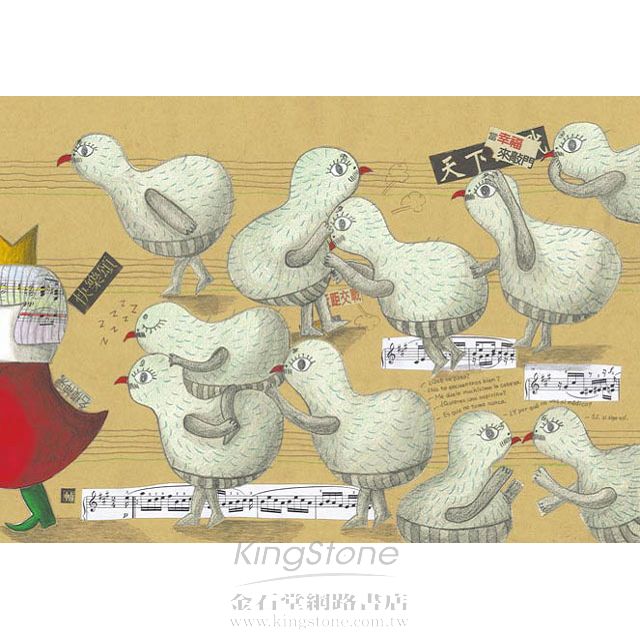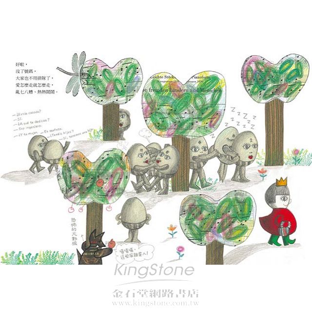 翻開書,一看到小公主的造型和顏色,我們立刻聯想到捷克插畫家柯薇塔.波茲卡(Kv?ta Pacovska)筆下的角色;小公主所率領的雞蛋人,以及她腳下由中文稿紙所鋪成的格子路,讓我們想到《愛麗絲鏡中奇緣》(Through the Looking-Glass)中的杭浦弟‧當浦弟(Humpty Dumpty),還有愛麗絲在奇境裡所走的棋盤路徑;童話般的開場白、小公主的紅色衣裝、躲在樹後的大野狼,也隱約帶有〈小紅帽〉這個故事的影子。作者拆解並運用以上這些經典童話的元素、再創作新童話的方式,是藝術表現的後設手法之一。這在許多知名且受歡迎的圖畫書中相當常見,例如:英國圖畫書作家安東尼‧布朗(Anthony Brown)就常常挪用超現實畫家馬格利特(Rene Magritte)的作品;《臭起司小子爆笑故事大集合》、《豬頭三兄弟》等則對傳統童話故事和童謠進行了遊戲性「諧擬」,創造出各種趣味的效果。如此,藉由小讀者熟悉的童話故事或童謠,拉近他們和書本的距離,成功的吸引他們閱讀故事,同時帶動他們思索和辨別:原本的故事和新的故事之間,到底有什麼不同和雷同之處?並針對故事本身,引發更進一步的顛覆性思考。