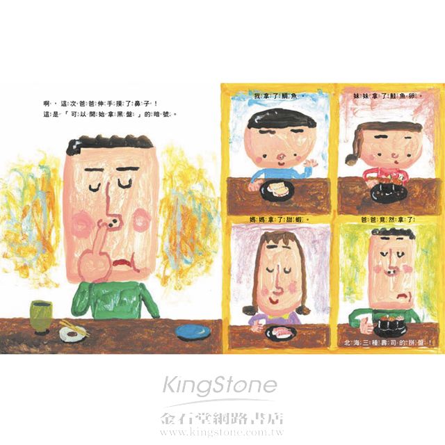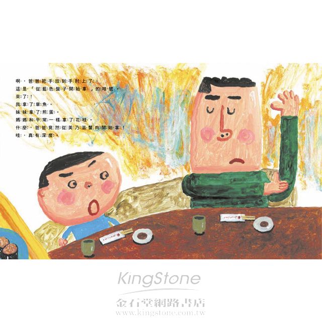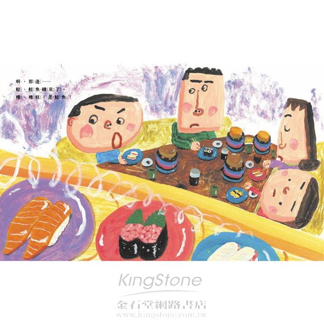 相信大家都有吃迴轉壽司的經驗,這是一個奇妙的地方,看著一盤盤轉動的壽司從面前轉過,令人在大飽眼福之餘,也不禁食指大動。日本知名圖畫作家長谷川義史非常擅長把日常生活中的事情,轉變成創作靈感,就像本書,他把大家會去吃的迴轉壽司,變成一家人快樂的時光。