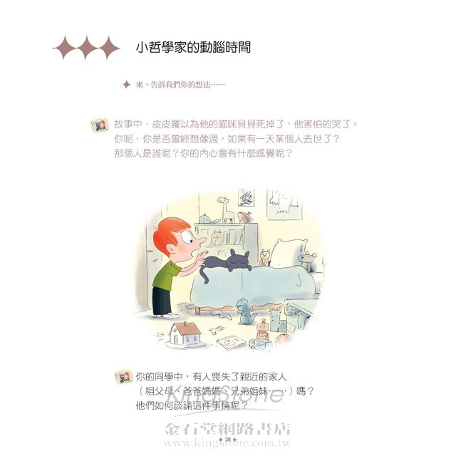 <<為什麼貓咪會離開?>>包含了生與死、擁有與失去、短暫與永恆……等多種哲學主題,跟著皮皮羅一起用正確的態度來討論死亡!