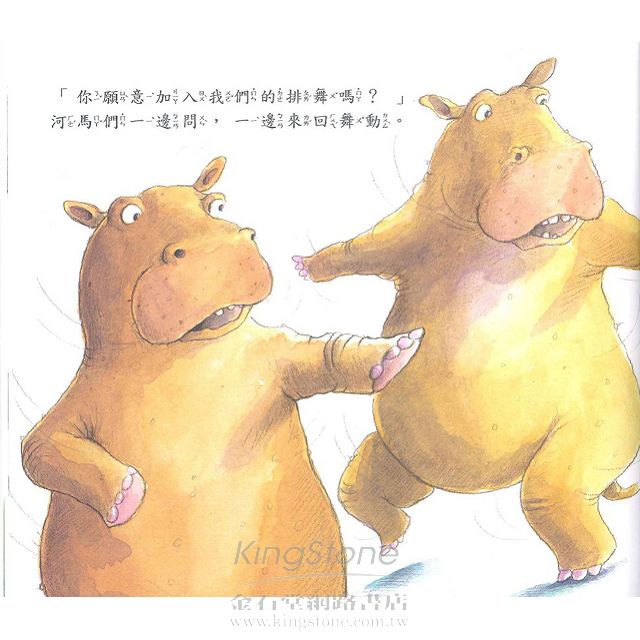 故事以動物為主角來展開所有的情節與趣味。每個動物說話的表情、眼神,跳舞的動作姿態,以及各種情緒的傳達等,在繪者的畫筆下,都表現的極為生動自然,讓人在觀賞圖畫時好像身在其中,相當逼真!而作者將動物不同的感受和想法,以對話的方式呈現出來,使人讀起來更能感同深受,產生共鳴,並引導讀者在潛移默化中了解美好品格的真義。
