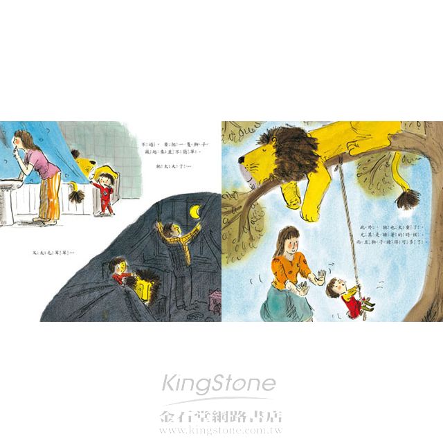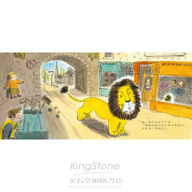 獅子危險嗎?或許吧,但如果有一隻溫和有禮貌的獅子出現在你面前,牠可以和你一起在床上彈跳,牠也喜歡聽你說故事,你會不會想要有一隻這樣的獅子朋友?這本書很快成為五歲兒子的最愛,每晚睡覺前他總是第一本就從書架上挑出這本書,要我再唸一遍。我們非常喜歡它的圖畫,不論是描繪屋子裡的各個角落,或是小鎮街道,處處溫馨美好!