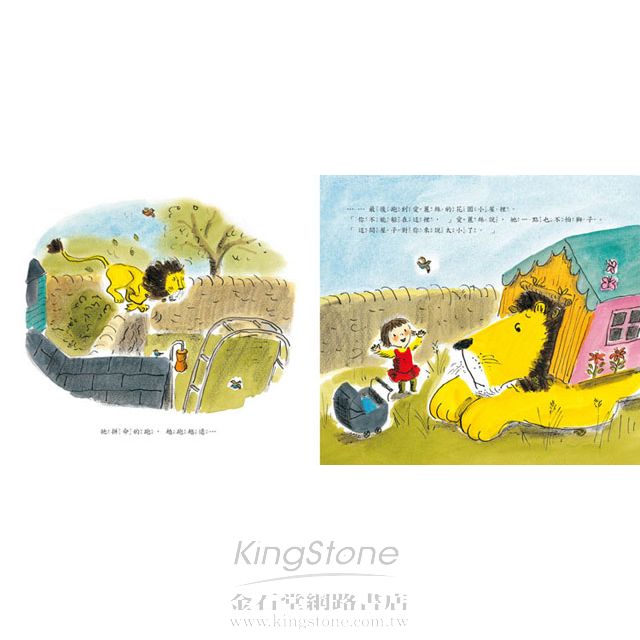 鎮上的人都很怕獅子,他們拿起掃把、擀麵棍…把獅子趕得遠遠的。獅子跑啊跑,跑到小女孩愛麗絲的花園裡。