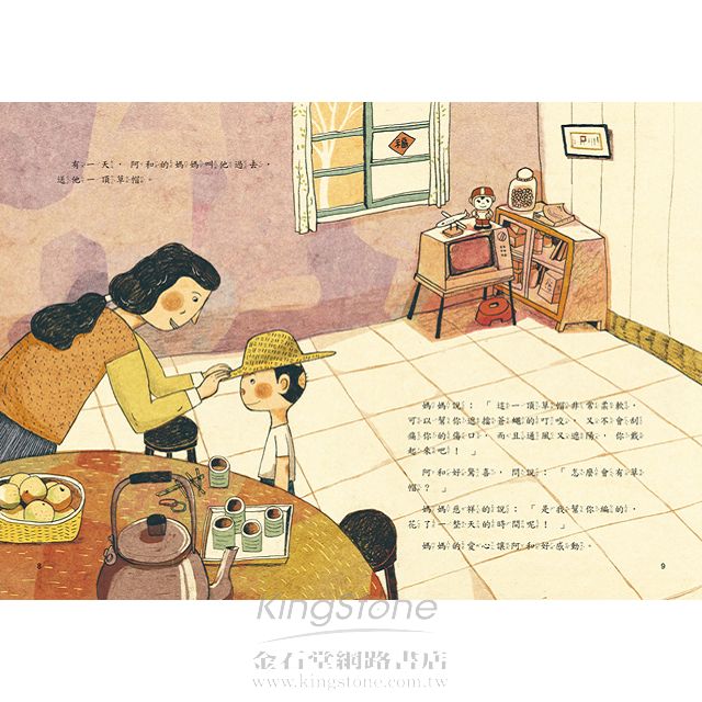 ●看了媽媽幫忙阿和戴草帽的瞬間畫面,多麼溫馨!再細看屋內畫了黑白電視,上面有大同寶寶,也點出早期臺灣自製電氣產品的可貴!