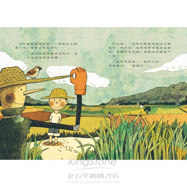 ●看到畫家筆下「狗的頭上和身上停了麻雀,稻草人的大草帽上有隻麻雀」的近景大圖像,更是童趣又幽默的最佳表現!