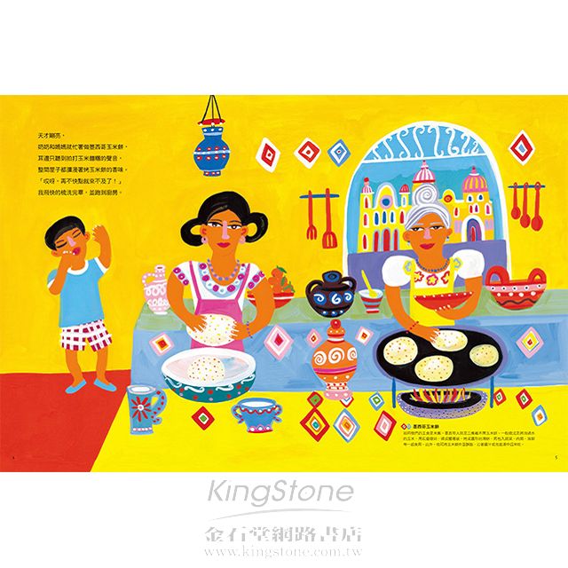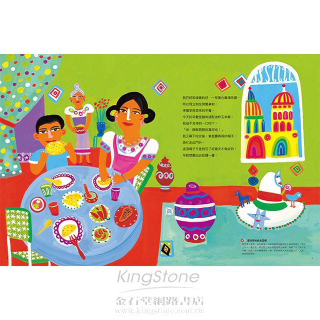墨西哥料理經過材料的取得、烹調法的傳授、料理的吃法,以及有關料理的傳說等條件審核,成為第一個被聯合國教科文組織列為世界文化遺產的飲食文化。《甜甜辣辣的回憶》透過小璜的帶領,認識墨西哥以玉米為主食的飲食文化,並介紹傳統慶典及地景風光。書中附錄帶領孩子深入墨西哥的地理位置、民族人種、文化特色、名勝古蹟、歷史事件等,更介紹了墨西哥最具代表性的食材:可可和辣椒。最後提供簡單清晰的食譜及料理步驟,讓親子在閱讀繪本之後,也能共同試做雞肉塔可餅體驗墨西哥傳統美食,增加閱讀以外的趣味性。所有食材均可以在超市購買,家長不必擔心原料的取得。