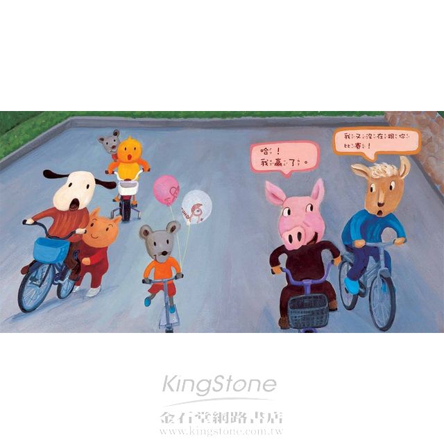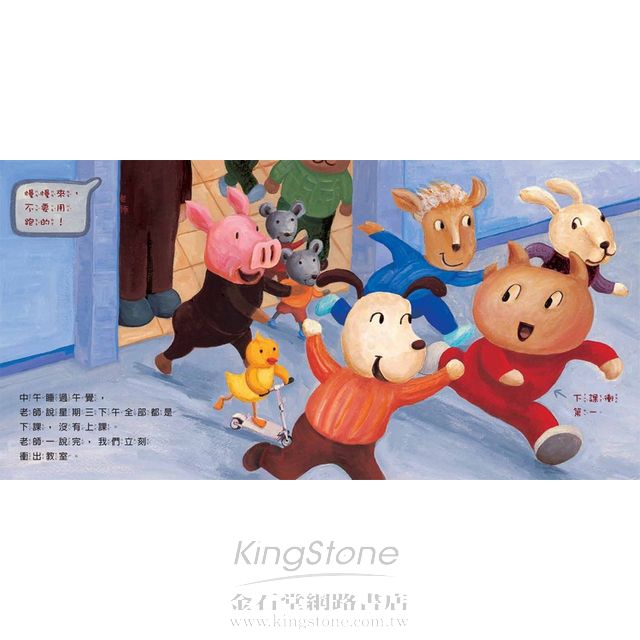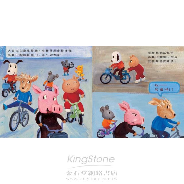 中午睡過午覺,老師說星期三下午「只有下課沒有上課」,小胖貓和同學立刻衝出教室。大家先在操場騎腳踏車,已經不需要輔助小輪的小豬和羊小弟開始互相較勁,只會騎「四輪」腳踏車的小胖貓則在一旁幫小狗扶車子。