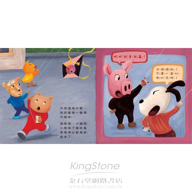 之後,大家開始準備放風箏,小豬忍不住又炫耀起自己拿到的風箏比小胖貓手上的來得漂亮。
