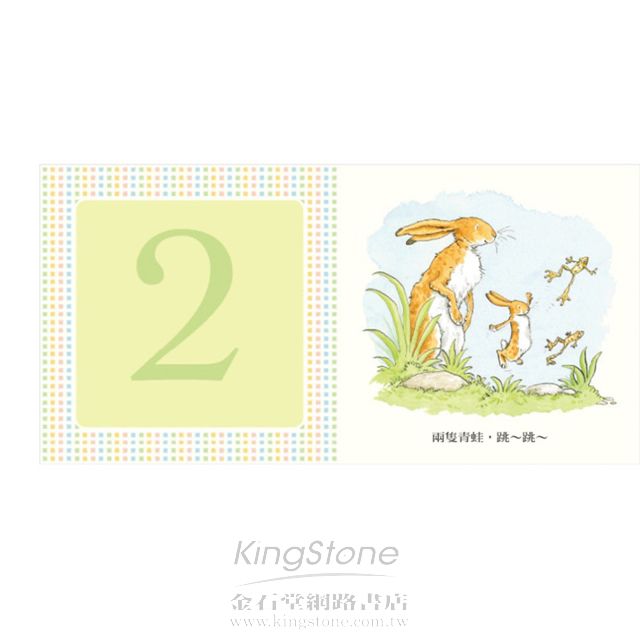 大兔子帶著小兔子到處玩耍,找找花園裡有哪些好玩的事?有1朵蒲公英、2隻青蛙、3隻蝴蝶……小兔子跟著追追又跳跳,玩得好開心,最後,躺在大兔子懷裡數星星,說晚安!
