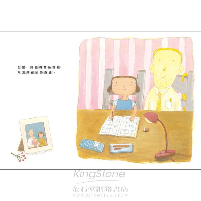 長大後,晴子仍然常感覺到黃色爸爸無形的陪伴。偶爾想起他時,或是覺得孤單、看見別人一家和樂時,晴子的心裡都會酸酸的,如果可以,她好想抱一抱、聞一聞爸爸的味道。有時候,晴子也會想像黃色爸爸對她的照顧、關愛與陪伴,即使後來有了新爸爸、組成新的家庭,但是,晴子知道,黃色爸爸會一直陪在她的身邊,永不缺席……。