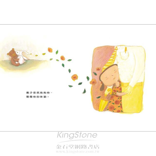 簡潔的文字、溫暖樸質的圖畫,交織出一個關於愛、親情與守護的故事。面對爸爸不在了的事實,作者以爸爸留下的黃色雨傘、全家福照片……,給予睹物思人的慰藉,並築構出孩子對爸爸的思念與想像。於是,因思念而起、虛有想像的父親身影,因孩子真誠的內在情感,讓他有了溫度,有了厚度,成為一個隱形的守護者,無形中,帶給孩子心裡、生活裡的庇護與溫暖。