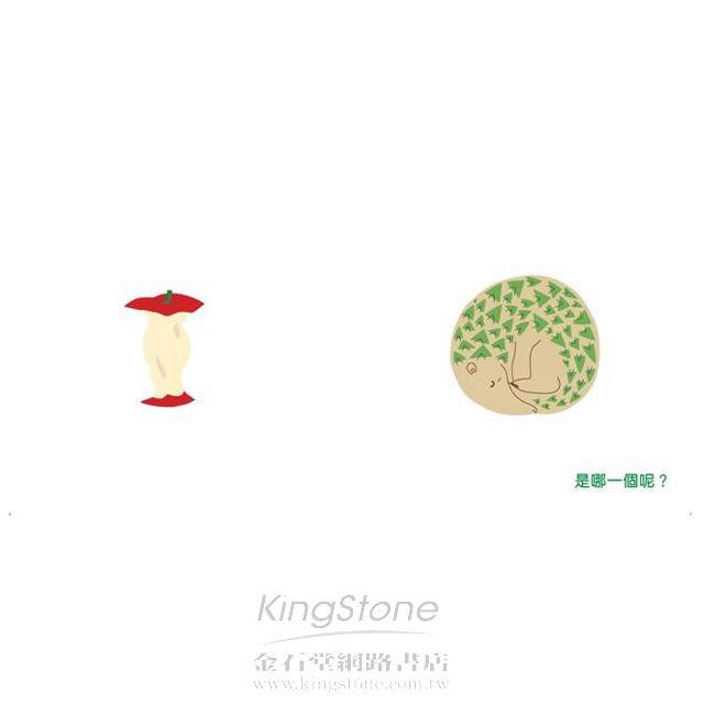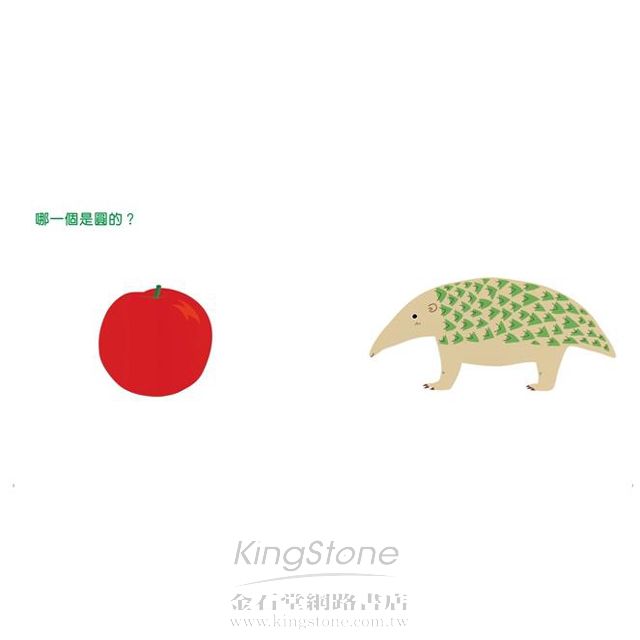蘋果和犰狳(ㄑㄧㄡˊ ㄩˊ)「哪一個是圓的?」,還沒翻到下一頁時,大家心裡的答案肯定是蘋果。結果呢?哎呀!被啃到只剩一點的蘋果和捲成球狀的犰狳,到底哪一個是圓的呢?