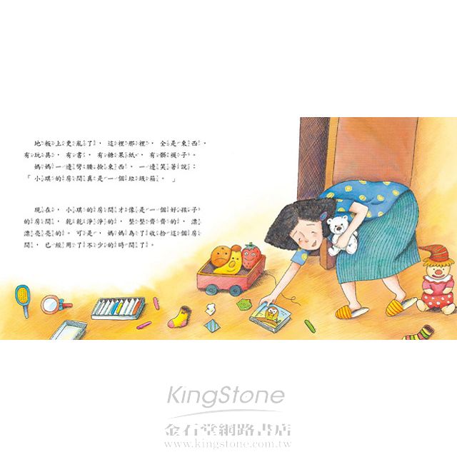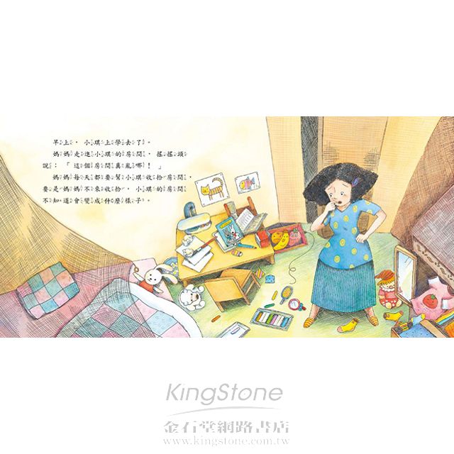 小琪的房間像一個垃圾箱,這裡那裡,全是東西,有玩具,有書,有糖果紙,有髒襪子……。每天早上,媽媽都要幫小琪收拾房間,要是媽媽不來收拾,小琪的房間不知道會變成什麼樣子?