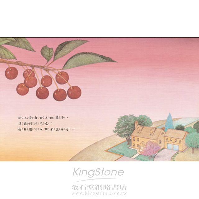畫者詹姆士.安迪卡特精緻的插畫,更將這首情感美好的詩,做了最生動具象的詮釋。他以細膩的工筆畫法,仔細描繪樹幹、鳥巢、葉脈的紋路質感,呈現出果實飽滿光滑的表皮,落葉乾枯粗糙的觸感,日出與日落的光線映照在樹上的明暗變化……層次分明地引導我們,將這份對樹朦朧抽象的情感逐一轉化成具體的實感與美感。即使連畫面的背景處理,都有意無意表現出木紋肌理,線條俐落乾淨的樸拙木刻版畫風格,呼應了崇尚自然的主題。圖畫與文字搭配得如此巧妙自然,使短短一兩行的詩句,像一粒小種子,投擲在我們心靈的土壤中,便使我們的想像力與感受力怦然一動,迅速生根、長葉、開花、結果。
