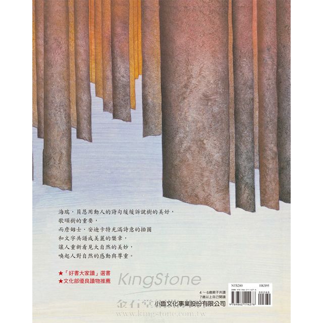 樹,是那麼地美好,像一首詩歌。它們在大自然中悄悄的成長、茁壯,依照著自己生命的節奏,在風中吟唱出優美旋律的音樂;那枝椏扶疏的葉叢裡,宛如簡短精練的字裡行間,蘊含了生動的意象、豐富的情感與生命無限的可能性。作者海瑞.貝恩以動人的韻文詩句,緩緩訴說著樹的綠蔭、樹的枝梢、樹的果實、樹的落葉與新芽,隨著季節時分更迭變換的樹的不同面貌,娓娓道盡了樹的美與樹的好……