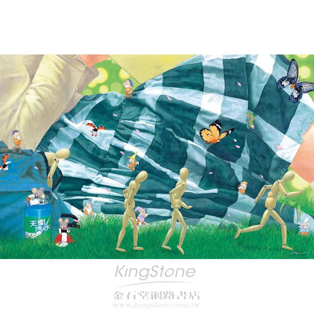 夢中女孩和木頭人從現實中出走,他們來到一個由現實與童話重組的理想世界,既有現實生活中的場景、特定的標的物;也有豌豆樹、美國龍、粉紅豬、穿靴子的貓、福爾摩斯、銀河鐵道……等童話世界裡的角色。讀者不妨嘗試挖掘一下,這本書裡到底隱藏了哪些文學作品?能夠認出的角色又有哪些呢?