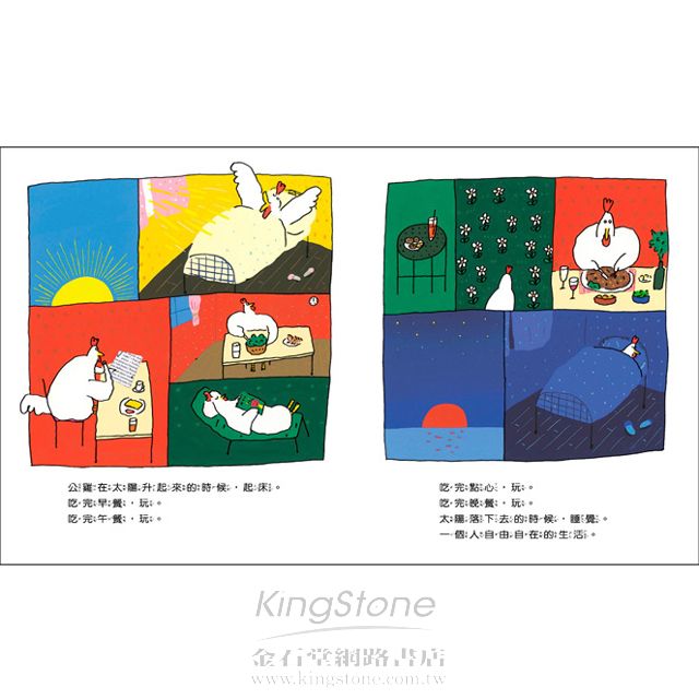原來,作者巧妙的把兩種作息不同的動物湊在一起,看著他們總是碰不著的煩惱模樣,讀者的心情也被勾著,又是忐忑、又是好笑的。繪者高畠純的圖像有著歡樂明朗的氣氛,展現逗趣的角色性格,看公雞等不及放下手中曬到一半的襪子,就在鄰居家門口探頭探腦,還有梳理雞冠、正襟危坐地等待新鄰居來訪的表情,就讓人忍不住笑出聲來。