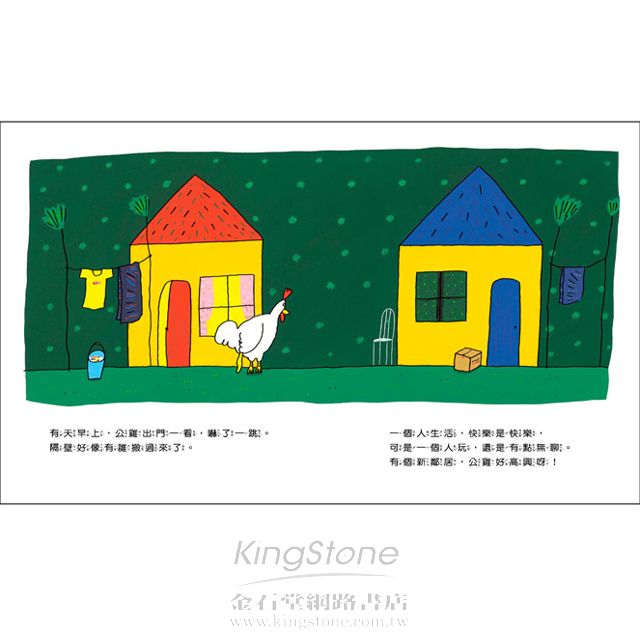 公雞的心裡充滿期待,好想和新鄰居一起玩喔!可是,公雞在藍屋頂的房子前走來走去,卻怎麼也遇不到這位神秘的新鄰居……「在睡覺嗎?還是出門了?」「是不是搬家太累了,起不來呢?」「好想見一面呀!」