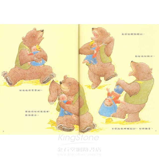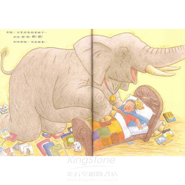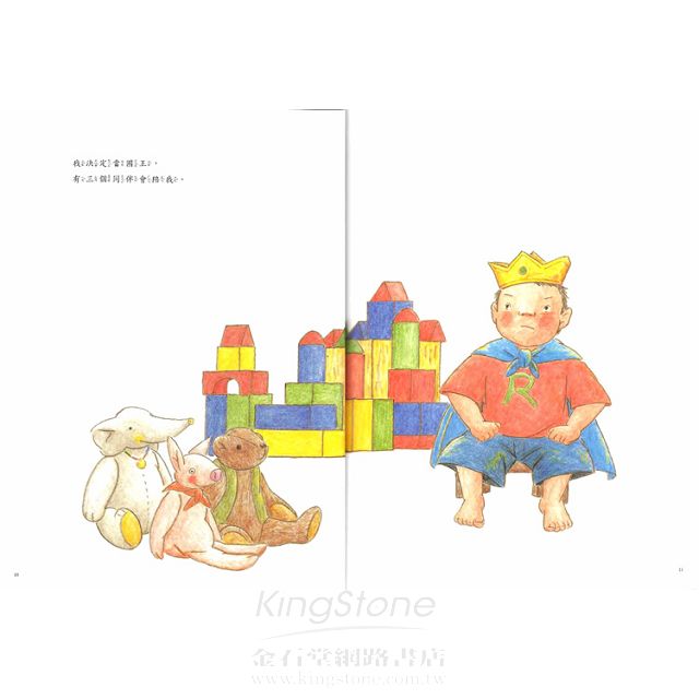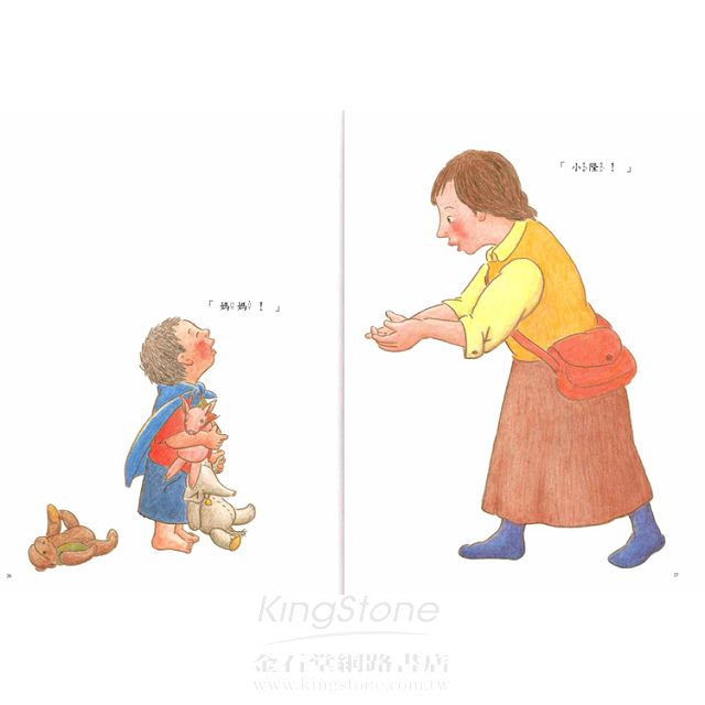 於是小隆扮成國王,和布偶們玩起了角色扮演的遊戲。強壯的大熊可以抱著他轉來轉去、小豬廚師會做好多好吃的點心、大象不僅會念故事書還會哄他睡覺……可是等了這麼久,媽媽怎麼還不來呢?
