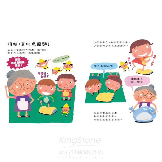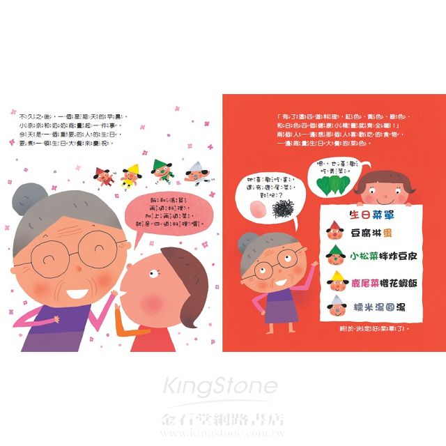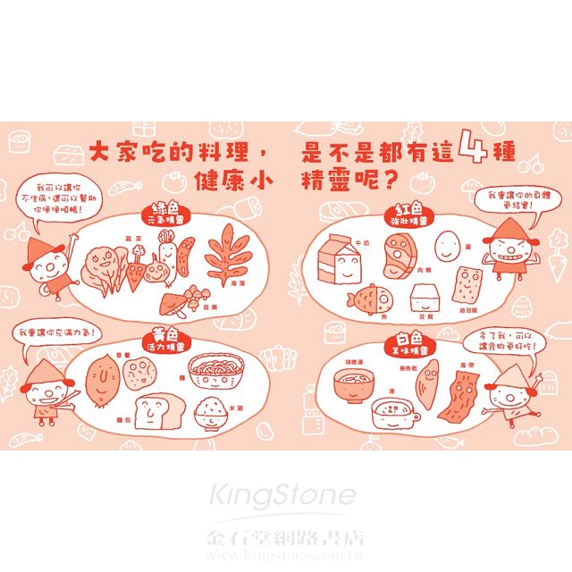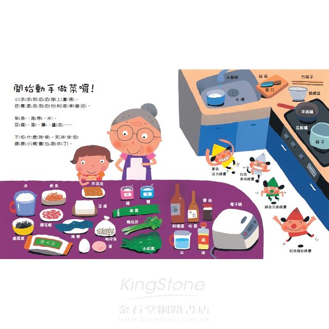 大 家吃的料理是不是都有這四種健康小精靈呢?【我的第一套好好吃食育繪本】系列讓孩子透過主角小奈奈與奶奶共同做料理的過程:構思菜單、採買食材、烹飪料理 到美食上桌,體驗親子料理的美好時光,並在過程中穿插四個活潑可愛的健康小精靈,引導孩子認識健康飲食外,更替孩子的健康把關、加油!
