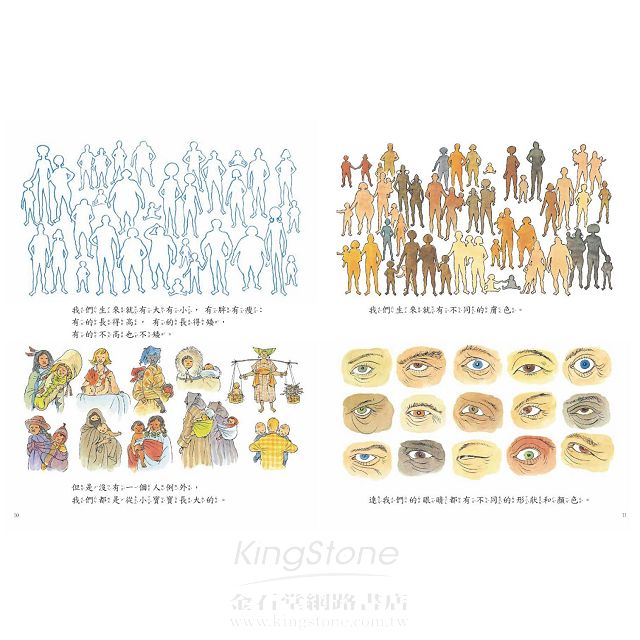 「和別人不一樣,到底是好?還是不好呢?」繪本大師彼得∙史比爾從小而大,循序漸進,用繪畫讓孩子看到自己和他人的不同──不同的外表、不同的興趣、宗教,大到不同種族的服飾、食物、房屋、文字語言。因為每個人都是獨特的,有獨特的思考,才創造出地球上豐富的文化和色彩。
