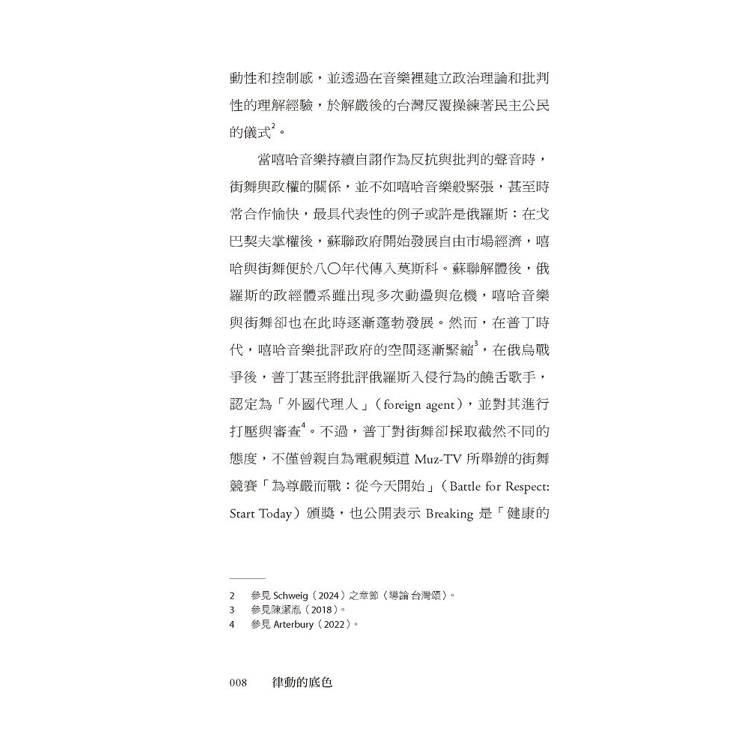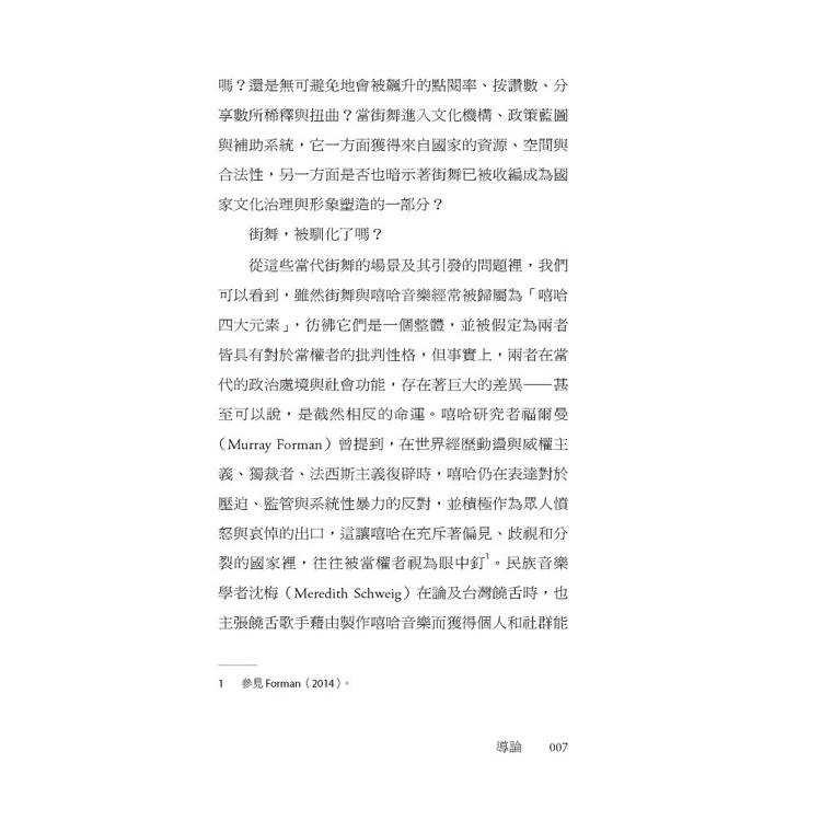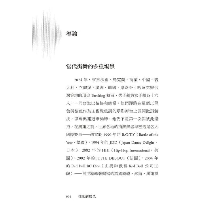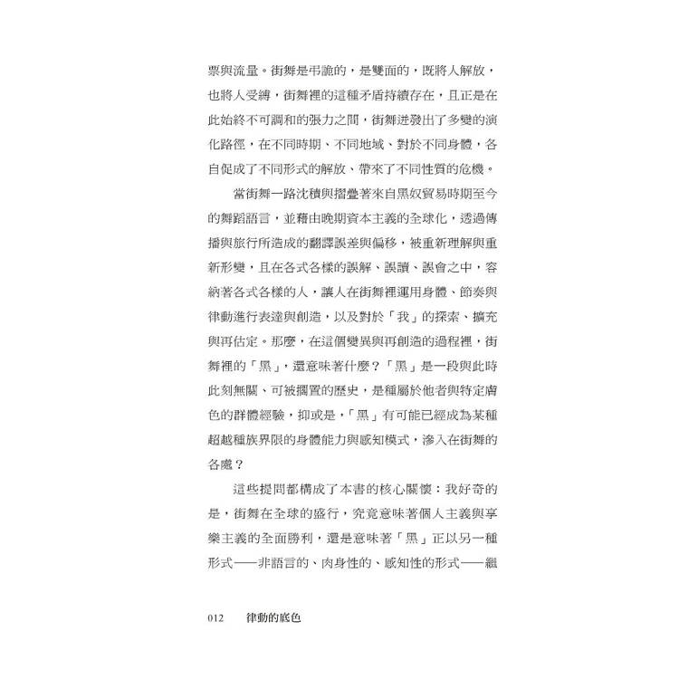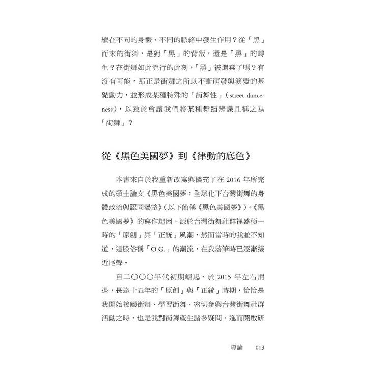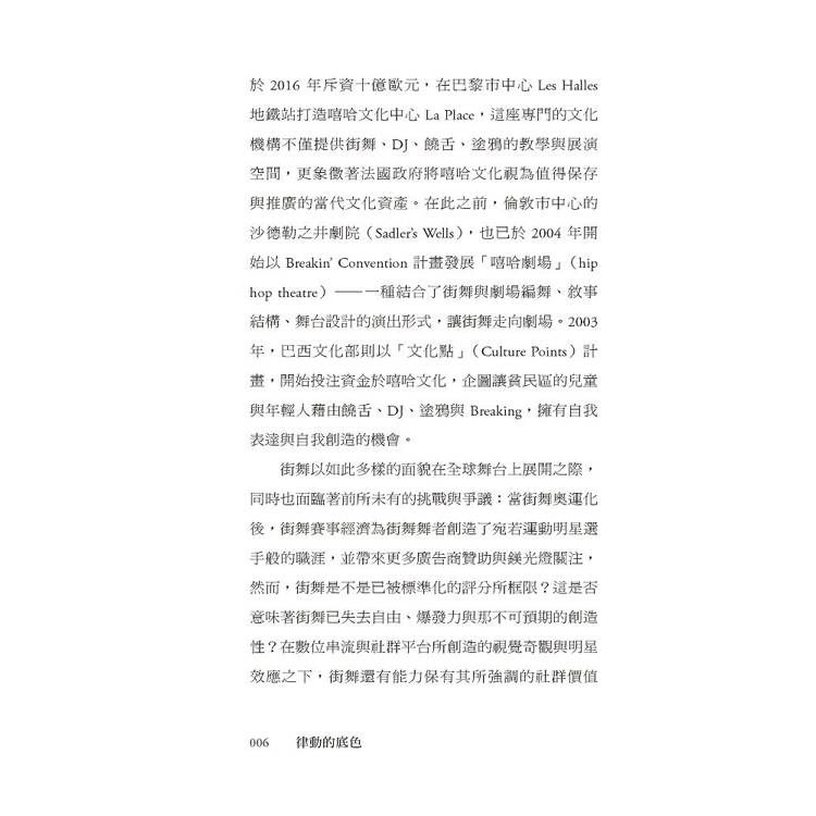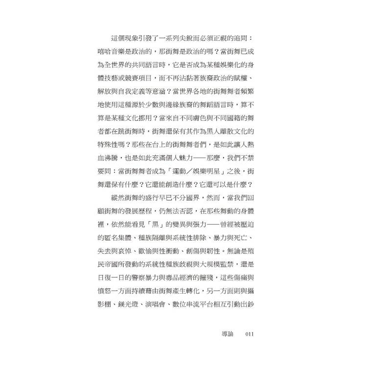 它誕生於「黑」,卻從未停留在單一的歷史或族群之中;既承載黑人離散社群的歷史創傷與生存抵抗,也在全球流動中不斷變形,長出新的身體與節奏。本書梳理了街舞在美國的發展脈絡,解析其與放克音樂、黑人民權運動與嘻哈文化之間彼此牽引、卻不全然重合的關係;同時聚焦台灣,探討攝影機與鏡子如何形塑早期舞者對視覺與「精準」的高度重視,以及後來為何發展出對於「正統」、「原創」與「音樂性」的追求。此外,當街舞登上奧運舞台、進入賽事經濟與文化政策體系後,能見度雖前所未有,但也面臨了被評分與被規訓的風險——街舞,還能不能保有與他人共振的社群感,以及自由即興的創造力?