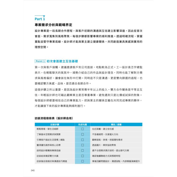 從接洽、丈量、提案到施工、交屋,提供可落地的全流程管理方法,避免混亂與失控。