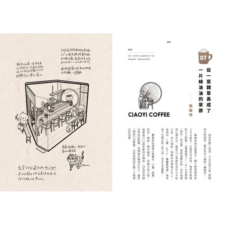 這本書在漫長的籌備期間,名單換來換去。有些店因為店主的生涯規畫收起來了,甚至截稿後,還是有幾間店在你們拿到書的時候,已經改變經營模式、搬家,或歇業。台北的咖啡店自從疫情之後,已經失去四年前的榮景,雖然新的店還是一直開,但是舊的店也在不斷消失。有些老闆開玩笑地跟我說:「啊!終於等到你來畫,我可以把店關了。」其實我才是常常在畫的當下,會突然一個情緒上來,「還好我來畫了,要不然一定會後悔啊」。