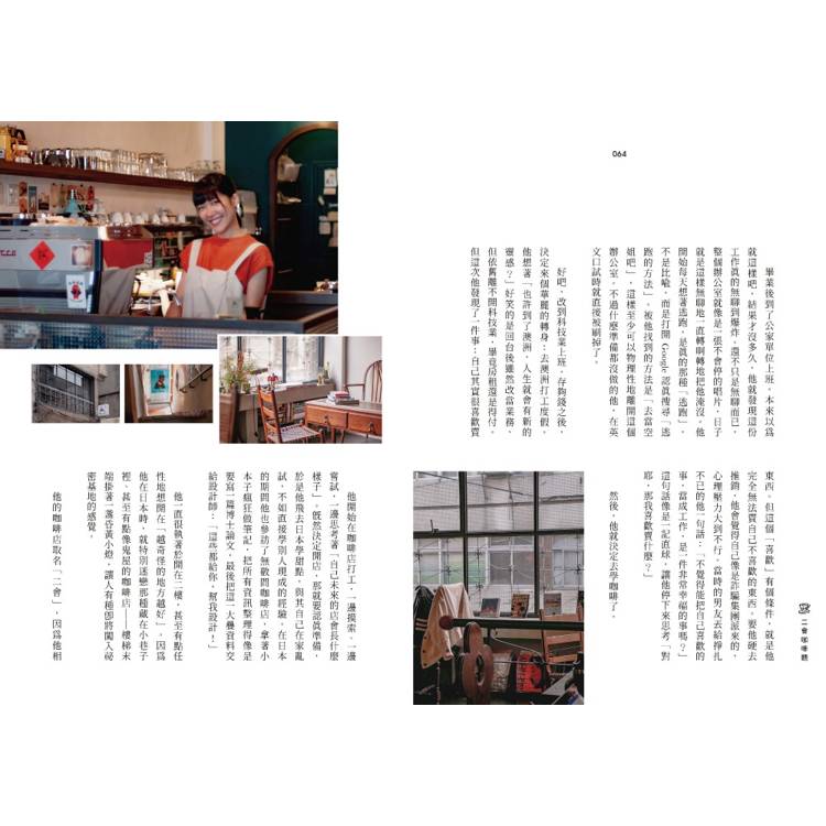 為了這本書,我跟每個老闆都聊了很久。歷經兩年的時間,趁著我女兒糕糕去上學時一間間聊,聊完再衝回家煮飯。我覺得老闆們的故事都比店裡的空間裝潢還精彩。很多人一開始都有另一份工作,得靠工作養開店這個「夢想」。開咖啡店這件事,被包裝得好像很夢幻,站在吧台帥氣煮咖啡,但剩下九成,都是令人頭痛的財務表格、堆積如山的雜事,還要面對隨時可能闖進來的恐怖奧客。聽他們說著,我常常覺得這根本就像一款打怪遊戲,EQ和時間管理都被迫獨自升級。