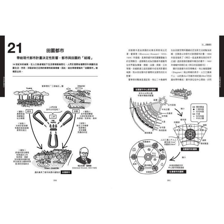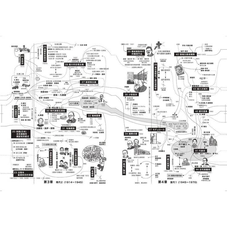 整本書是由按照時代順序排列的五個章節所組成:第1章是「現代以前」(Before Modern),第2章(1851-1914)與第3章(1914-1945)是「現代」(Modern),第4章(1945-1970)與第5章是「當代」(Present Time;Contemporary)的構成。全書一開始的「建築思想地圖」與「建築思想關聯年表」或許可以成為透過從空間與時間的關聯來理解建築思想的線索吧。各章之間還穿插了以建築旅行為主題的專欄。至於本書最後的附錄「建築書的影響力」以及「拓展建築思想的世界/日本建築家」,則介紹了擁有強大影響力的建築著作與建築家群像,相信會有助於更具體而全面地理解本書。