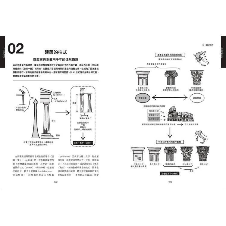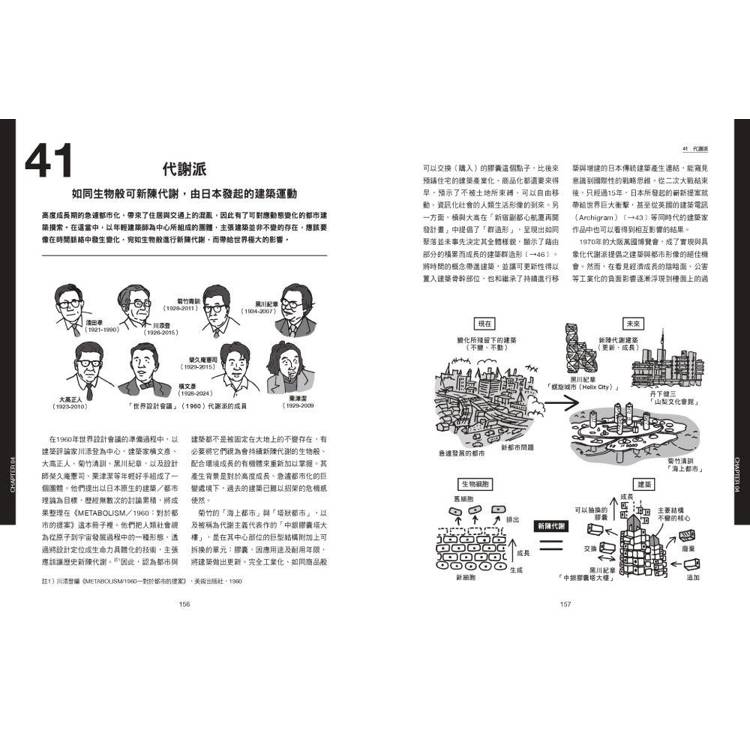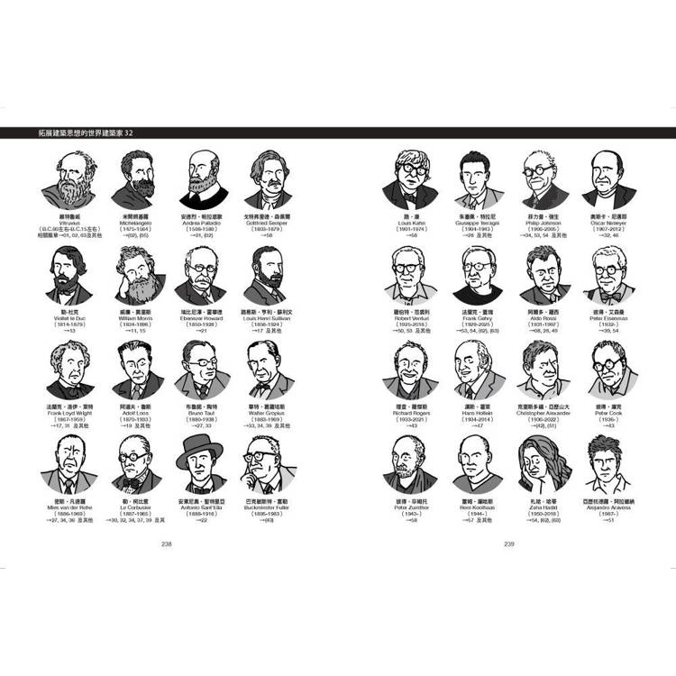 不輸主文的精采資訊,從全書一開始的「建築思想地圖」與「建築思想相關年表」,理解思潮發展脈絡。各章之間還穿插「建築旅行」主題專欄。至於本書最後的附錄「建築書的影響力」以及「拓展建築思想的世界/日本建築家」,特別介紹彙整了擁有強大影響力的建築著作與建築家群像。