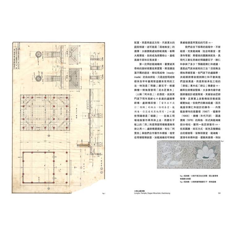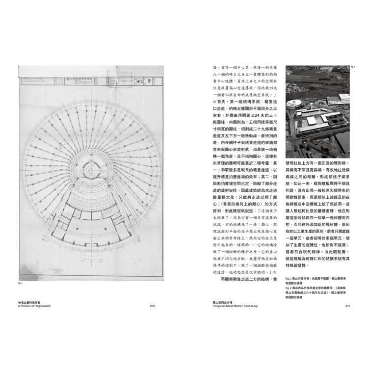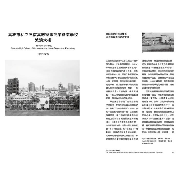 本書首度完整梳理陳仁和的生平和建築實踐,收錄1954至1976年共22件作品,包括早期代表作品如高雄佛教堂,由三塔構成入口,外觀融合日式、西式與印度風格,內部以鋼筋混凝土結構堆疊出如印度佛教石窟的大殿空間,混搭成現代化的佛教堂;還有著名的三信家商波浪大樓,線條錯落律動的清水建模外牆、漸進式調整樓地板高低成階梯教室,頂樓設日式兩坡水曲頂,屋脊兩端有象鼻雕塑,精密力學構成會跳舞的房子;以及最為經典的鳳山肉品市場,大膽採用「圓形市場」的概念,放射狀車道容納二十九輛卡車直接卸貨,解決豬隻拍賣作業的混亂,一舉拿下兩座建築金鼎獎。