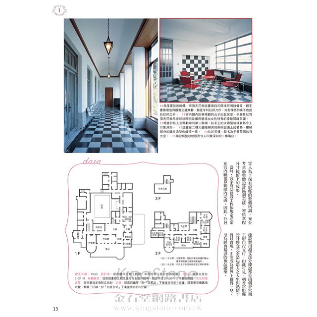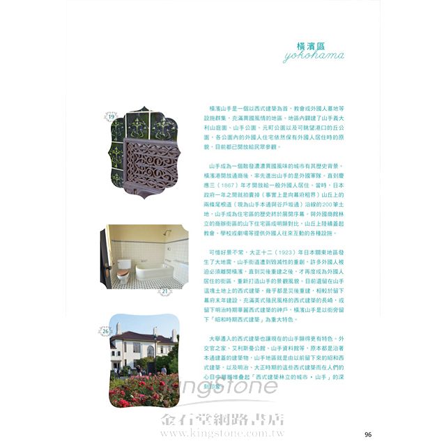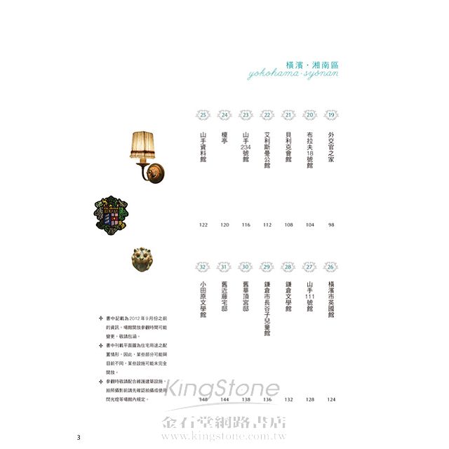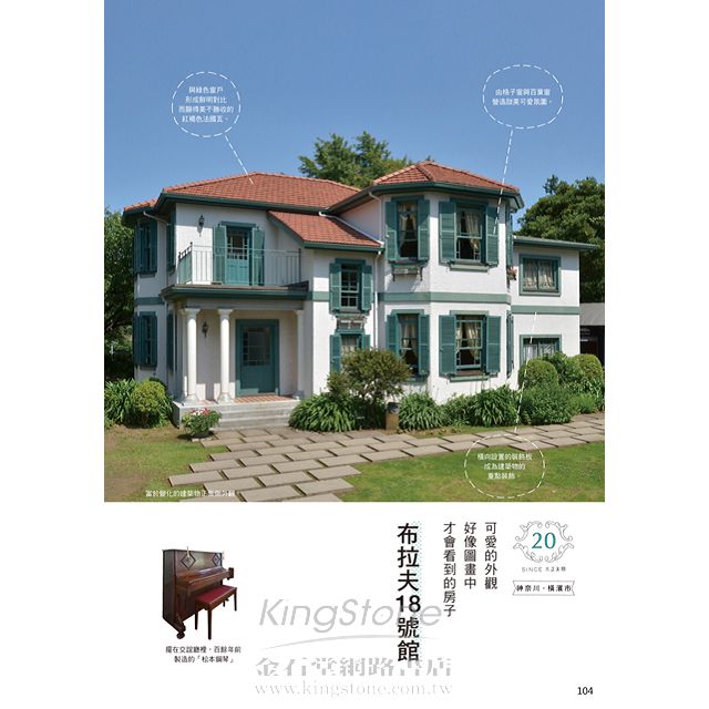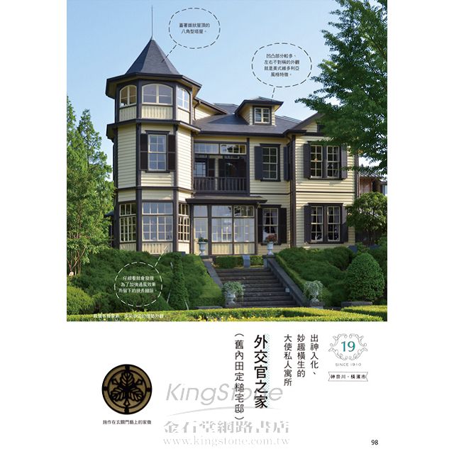 書中收錄的32棟西式建築都是位於日本東京、橫濱˙湘南區,充滿近代西式建築風格的住宅(和風御殿等除外),都是鑑於不定期開放,絕對有機會參觀的觀點而挑選,以上流社會的華麗西式豪宅為首,廣泛地介紹了橫濱山手的西式建築群、大學校園內的外國人教師館,乃至第二次大戰前最時尚的住宅。