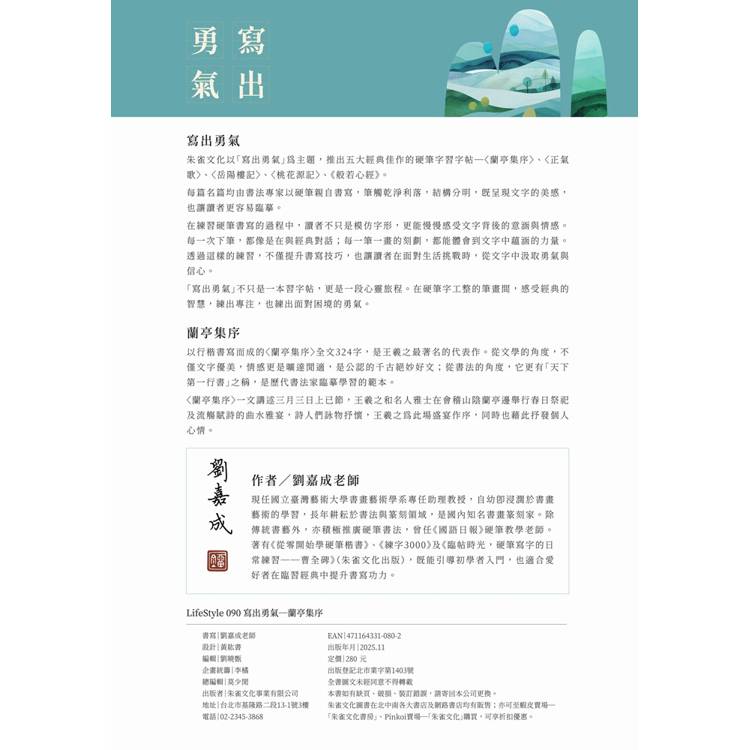 〈蘭亭集序〉由書畫名家劉嘉成老師親筆書寫,筆觸乾淨俐落、結構分明。系列結合老師示範手帖、描紅臨摹,搭配180度攤平膠裝,每日不間斷練字,不僅汲取經典正能量,也能搭配落款,留下屬於你的專屬勇氣作品。