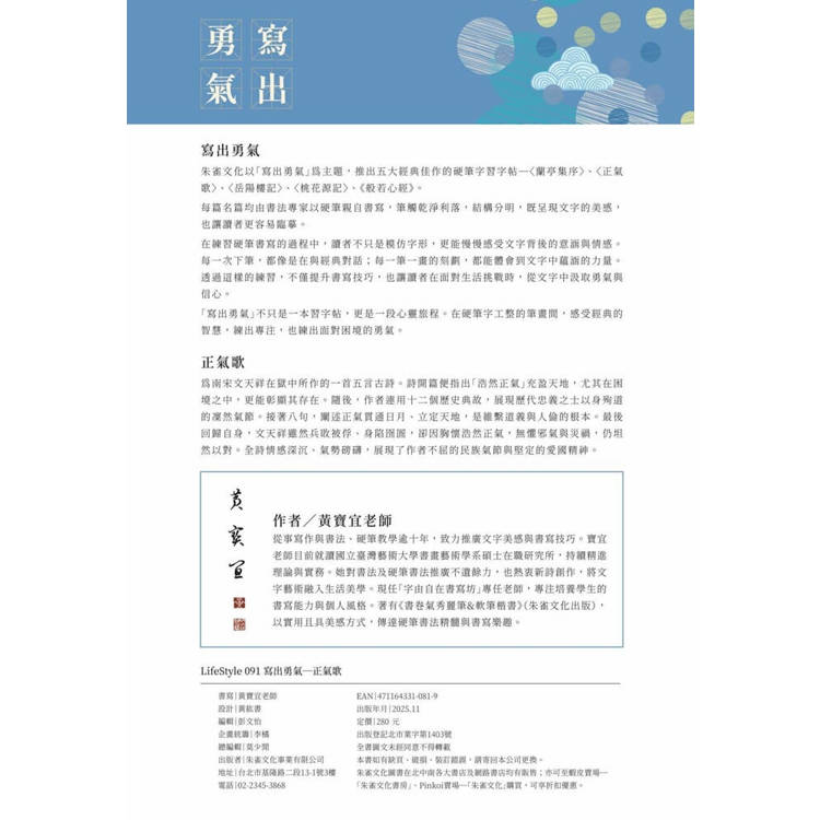 〈正氣歌〉由從事寫作與書法、硬筆教學逾十年的黃寶宜老師親筆書寫,筆觸乾淨俐落、結構分明。系列結合老師示範手帖、描紅臨摹,搭配180度攤平膠裝,每日不間斷練字,不僅汲取經典正能量,也能搭配落款,留下屬於你的專屬勇氣作品。