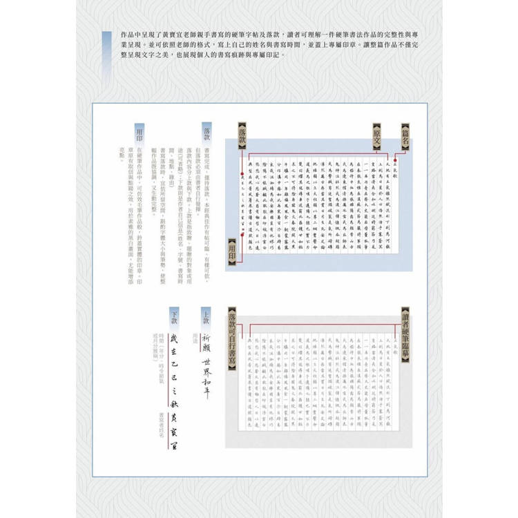 依照老師落款示範,掌握落款技巧。書頁攤平設計、紙張滑順好寫,完成後可自行撕下裱褙,創作屬於自己的完整作品。
