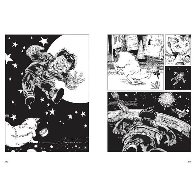 這篇是我值得紀念的人生第一篇漫畫,深受柘植義春的〈螺旋式〉影響,因為是極具意義的第一篇,所以我刻意讓劇情發展有些讓人費解,這樣比較不會膩。站在車子引擎蓋上的西裝怪人,騎著貓去拯救世界,但我們永遠無法拯救世界,因為世上總有某處起火了。我到現在還是蠻愛這篇的,畫完這篇後我就心滿意足的去畫〈宇宙的幽靈〉了。開頭的「感受到了熱氣」,後來我才發現是受到了墨必斯的〈貓之眼〉的影響。