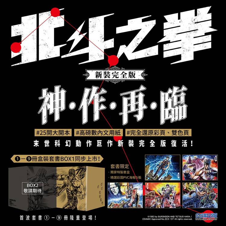 本次尖端出版除了結合日本「新裝版」的華麗金色書衣以及「究極版」的彩頁、雙色頁,還會放大開本、採用高磅數漫畫用紙,以完全版的規格帶給所有北斗之拳的求道者最新最完美的「新裝完全版」!