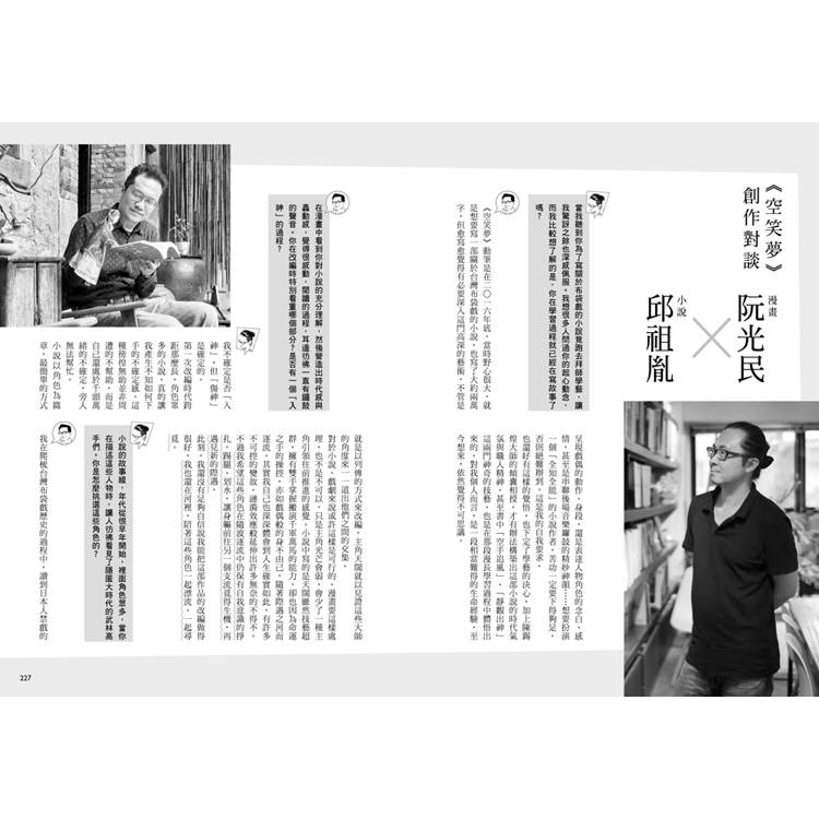 《空笑夢》原著小說是一部以台灣布袋戲職人生命史所串起的動人時代篇章,不僅故事曲折,人物多元,角色生動,在遼闊的時空跨距下,對於布袋戲各項文化技藝的描繪更是驚人深刻,充滿畫面感,幾乎可視為布袋戲職人版的「一代宗師」列傳,因而榮獲兩大文學獎的肯定。這次由多次榮獲金漫獎的漫畫家阮光民重新演繹改作為圖像版,除保留萃取原著充滿時代感與文藝性的精神,為了讓故事更聚焦,漫畫家梳理剪除部分旁支,讓主角線更清晰,同時發揮所長,特別強化人物關係的交集互動與內心戲的轉折,時時叩問什麼是 「家」?什麼是 「家人」?以及主角內心「成為匠人或是藝術家?」的抉擇掙扎,成為故事衝突與轉折的關鍵。