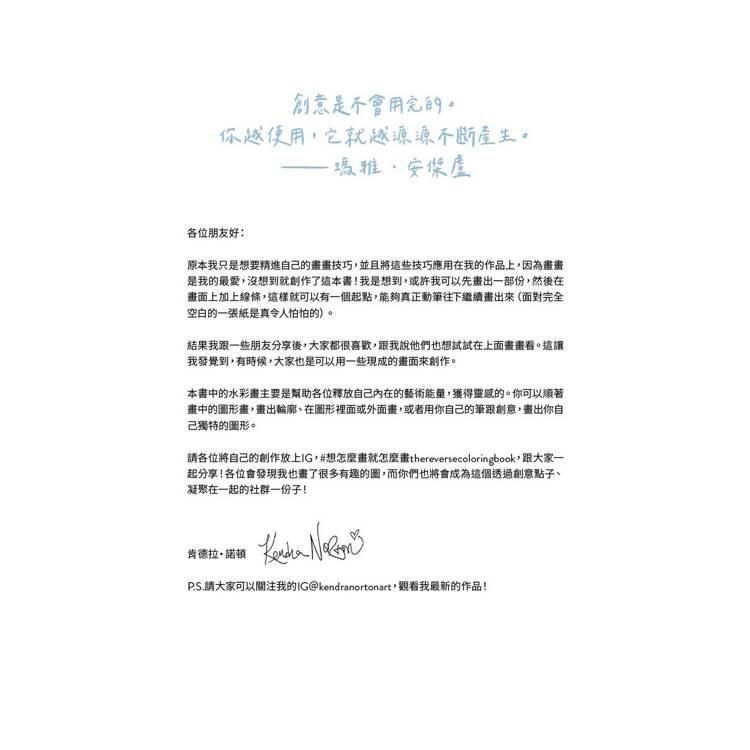 本書是全新類型的畫畫書,既可以讓人展現自己獨特的創意,又可以在畫的過程中培養正念,達到讓頭腦放空、靜心的狀態。