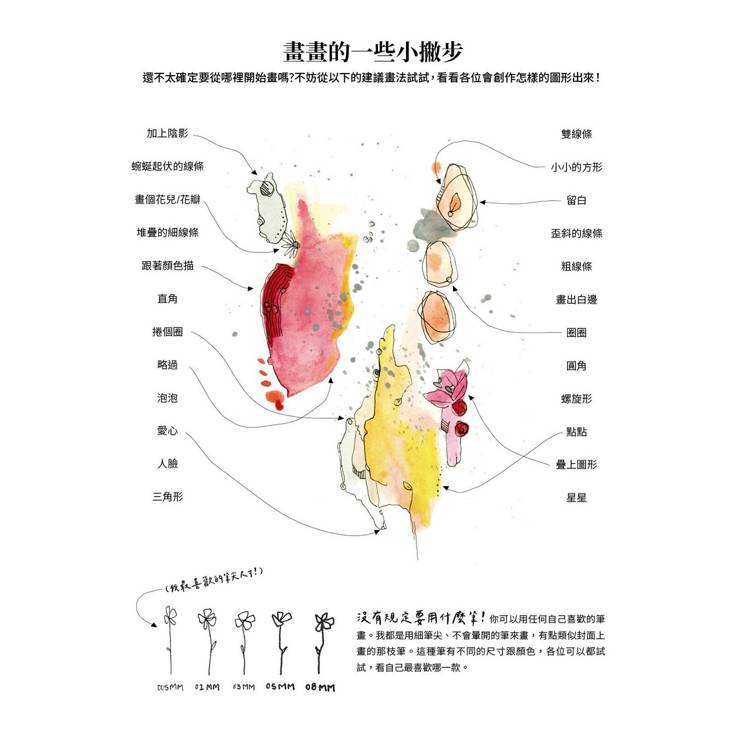 本書恰恰與著色畫相反,著重於「不要留在線條內」,因此可以讓人大膽地、有自信地來畫。