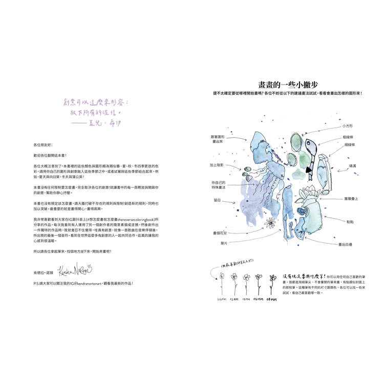 本書恰恰與著色畫相反,著重於「不要留在線條內」,因此可以讓人大膽地、有自信地來畫。