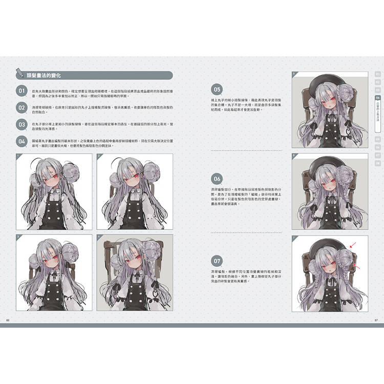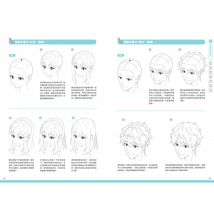 頭髮的結構╱頭髮的畫法╱頭髮的長度╱頭髮的質感╱頭髮的動態╱高光的形狀與畫法╱髮梢的畫法╱情緒與頭髮的關係╱髮型的變化╱髮飾的變化
