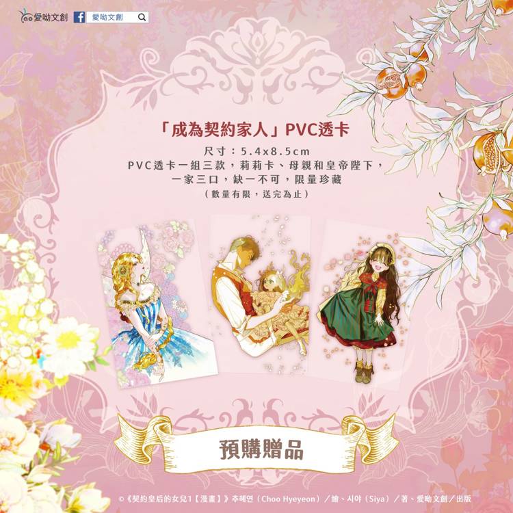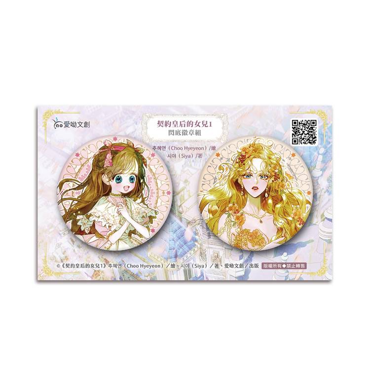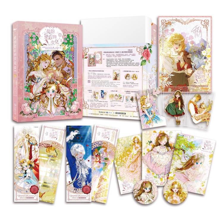 契約皇后的女兒1【漫畫】(A款套書-閃底印簽組)╱全彩漫畫第1集、明信片A組(1包3張)、母女款雙閃徽章組(1組2款)、壓克力裱裝燙色印簽簽名板、鐳射票(磨砂鐳射卡&絲絨銀卡票各1張)、預購贈品「成為契約家人」PVC透卡(1組3張)