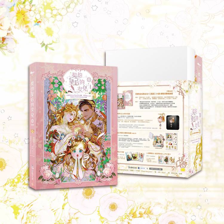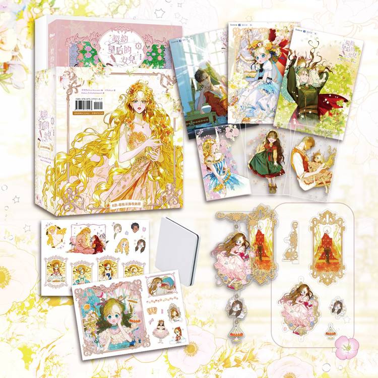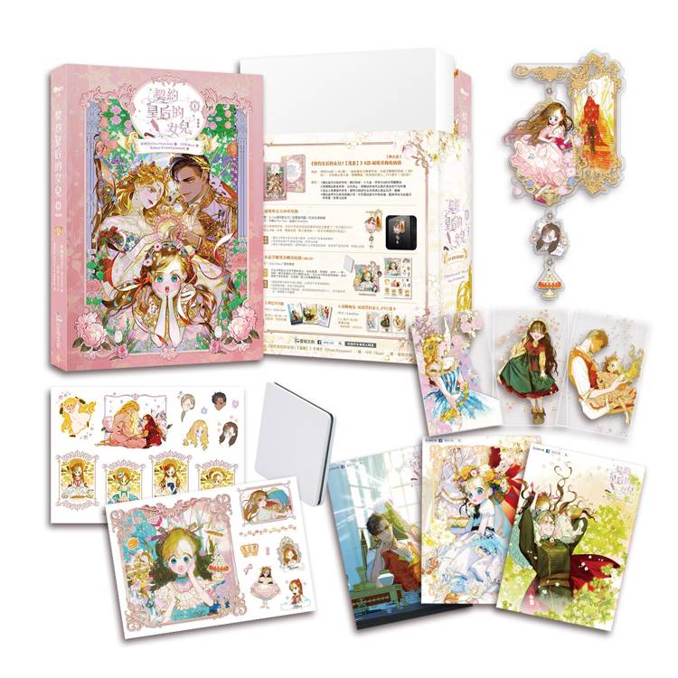 契約皇后的女兒1【漫畫】(B款套書-磁吸吊飾收納組)╱全彩漫畫第1集、明信片B組(1包3張)、磁吸壓克力串串吊飾、水晶浮雕轉印貼紙(1組2款)、附天地蓋白色方盒、預購贈品「成為契約家人」PVC透卡(1組3張)
