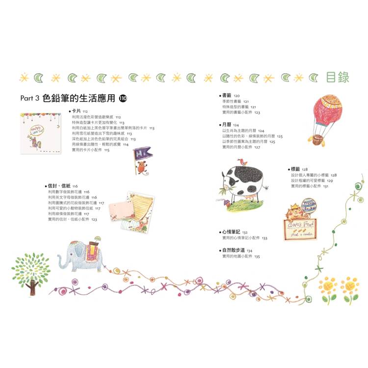 此外,書中提供7種生活應用提案,將畫作轉化成卡片、信紙、書籤、月曆、標籤、手札等實用文具,創造獨一無二的專屬文具。