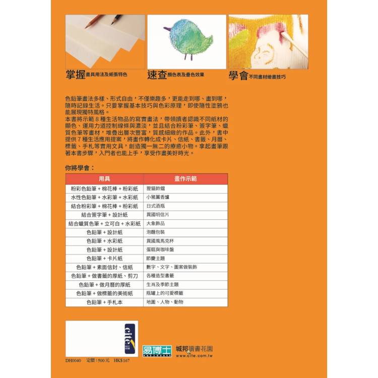 本書在8種生活物品的寫實畫法教學中,帶領讀者認識不同紙材的顯色、運用力道控制線條與濃淡,