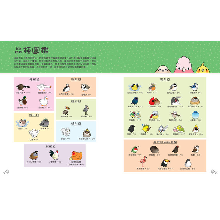 ◎彙整收錄「表情目錄」「毛色調色盤」「翅膀特色花紋」「品種圖鑑」,還可盡情在附錄的「鳥寶著色頁」進行組合練習!